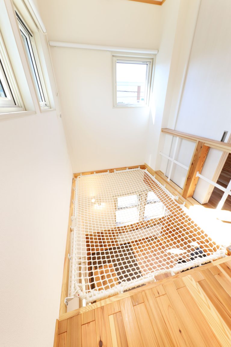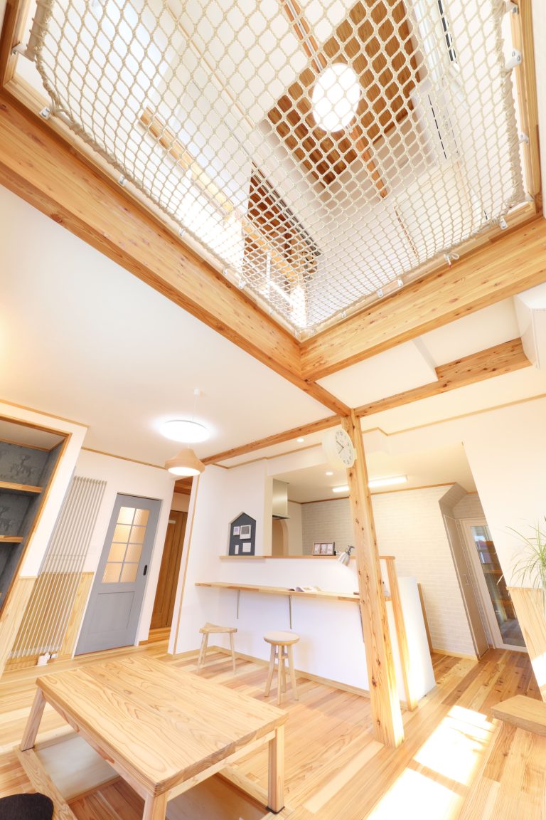 リビングの吹き抜けにあるアスレチックネットは、子供たちと遊んだり、スクリーンを下して映画や時には家族写真を写したり、居心地のいい空間は家族みんなの気持ちを緩めてくれる大切な場所です。