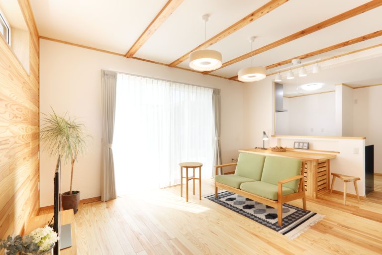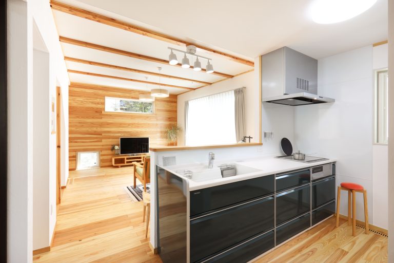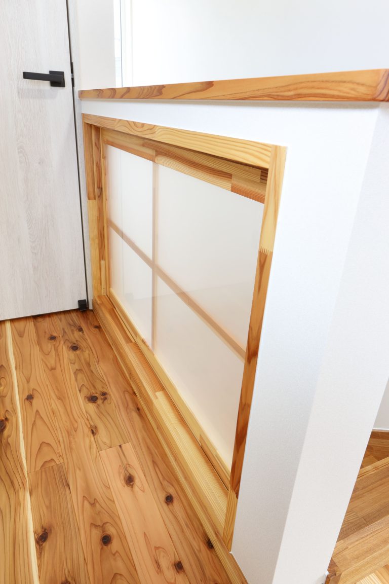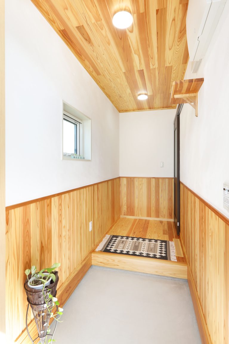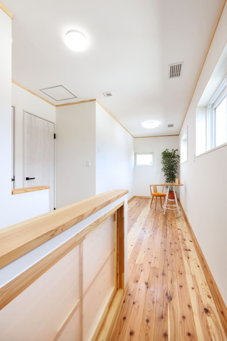 「最高のお家を建てていただいてありがとうございます」当時、大学生のお姉さん、高校生の弟さんからの言葉がとても嬉しかった一軒です。お家としては、玄関前に伸びた庇がポイント。景観の邪魔にならず、夏の陽射しを防ぐ計算された設計になっています。