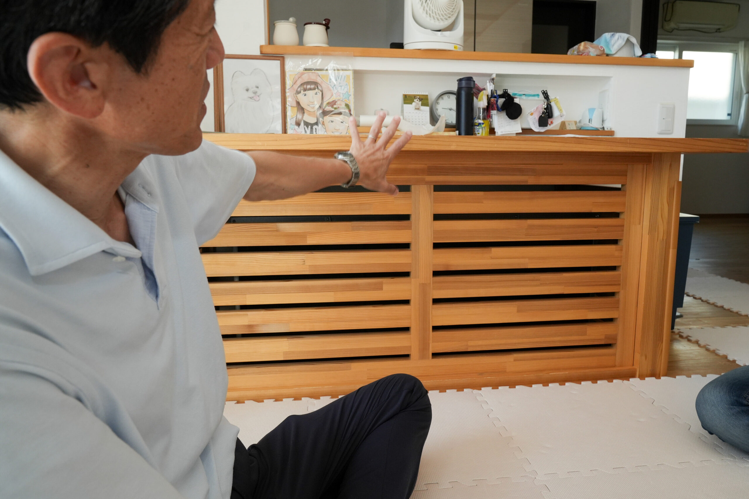 はい、私も、T様の第一印象は、しっかりと準備して家族ともしっかり話をしている方だなという印象でした。今回のお家もT様ご自身の造作だったり、ワンちゃんのために、地べたにはものがないようにしたり。このテレビ台の下の脚もご主人が造作したんですよね。