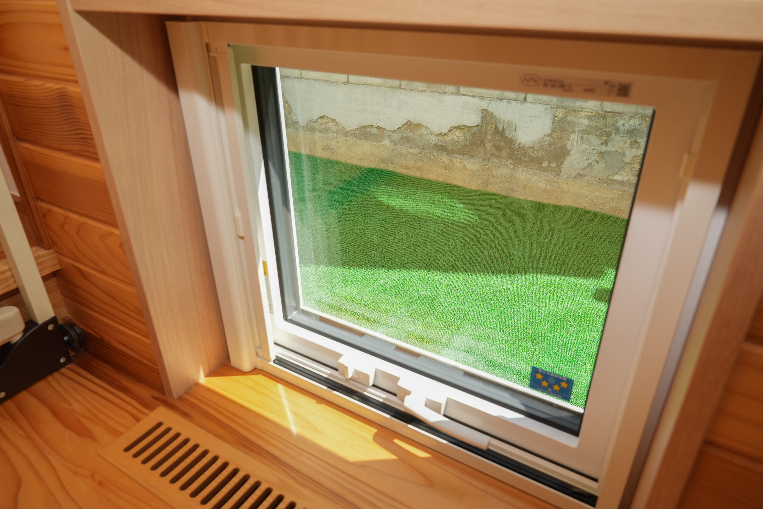 窓の外に人影が来るとやっぱり驚いちゃったりするし、だから何も景色が変わらない窓をつけてあげるんです。